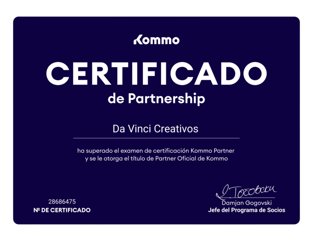 A través de nuestra alianza estratégica con Da Vinci Creativos, contamos con la certificación oficial de Kommo Partner. Esto garantiza que tu negocio cuenta con el respaldo de expertos certificados, capaces de implementar integraciones de CRM de primer nivel y automatización de ventas avanzada.